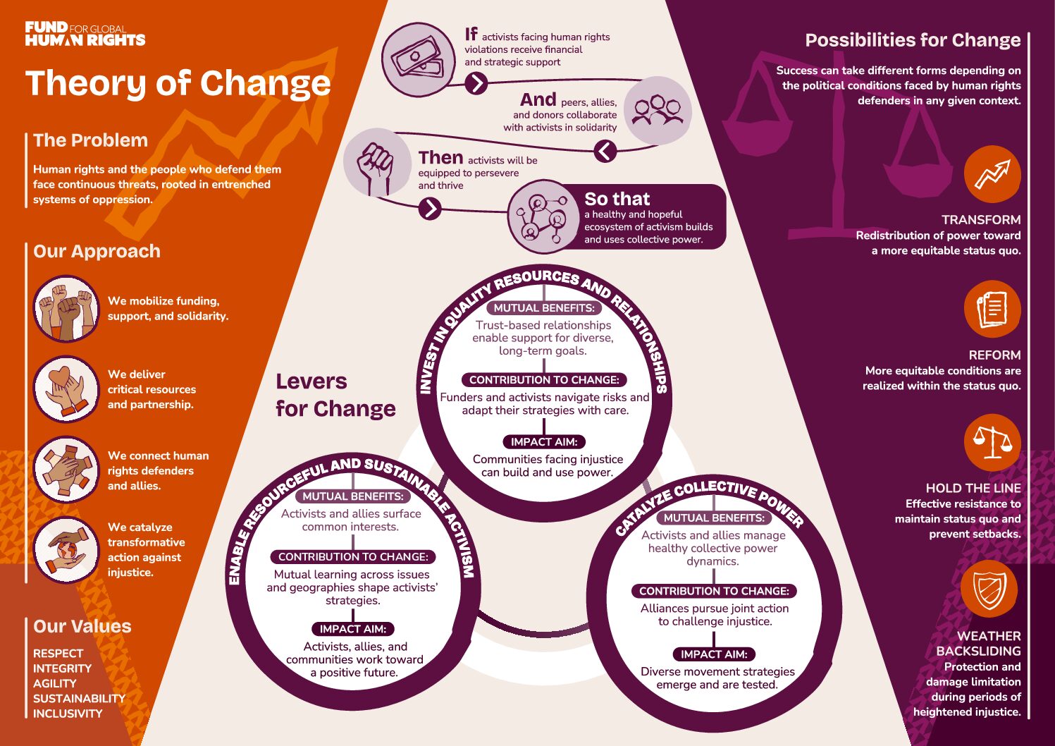 Our theory of change guides our support for human rights movements in diverse and complex contexts. Using an evidence-based approach to connect our work with learnings and identify strategic levers for effective progress, our theory of change helps us ask bold questions, fuel creative adaptation, and act on our insights toward a more just and equitable world.